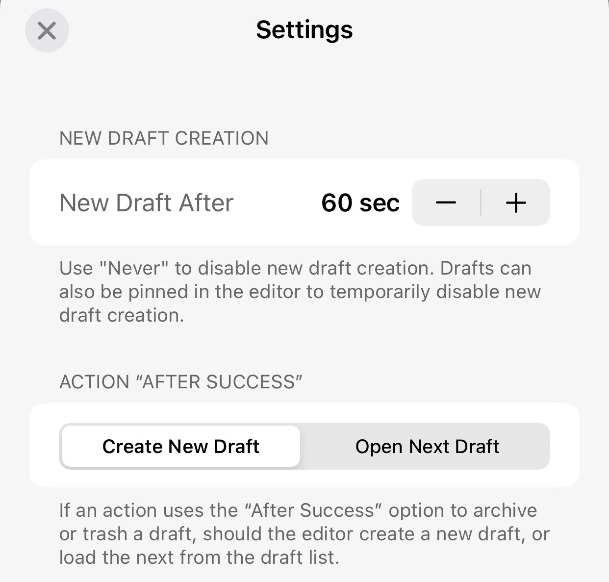 For my iOS settings, I create a new draft after 60 seconds or after a successful action (like Add to Obsidian).