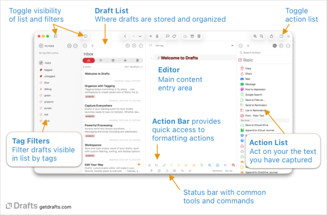 On macOS, Drafts also has an app window [[Drafts – Toolbar|Toolbar]], which you can toggle to show or hide with a hotkey ⌥ ⌘ T. It offers quick access to navigate & filter, create, dictate, flag, tag, or move drafts, as well as access a command palette, quick search, and preview.