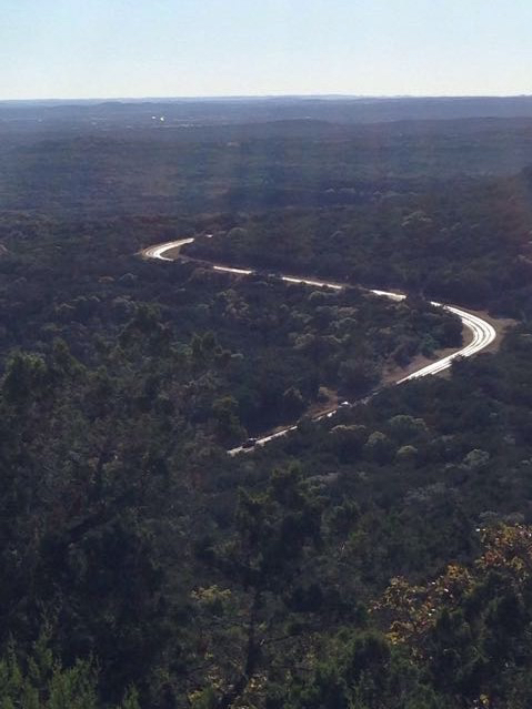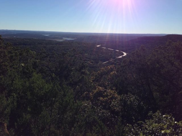 I thought this might be an interesting shot of Lake Travis and the winding hilly road along the north shore with the sun starting to go lower in the sky. First, I tried to take a vertical shot to see how that looked. This seemed to make the lake appear too distant but instead emphasized all the trees in the foreground (which aren’t as interesting).